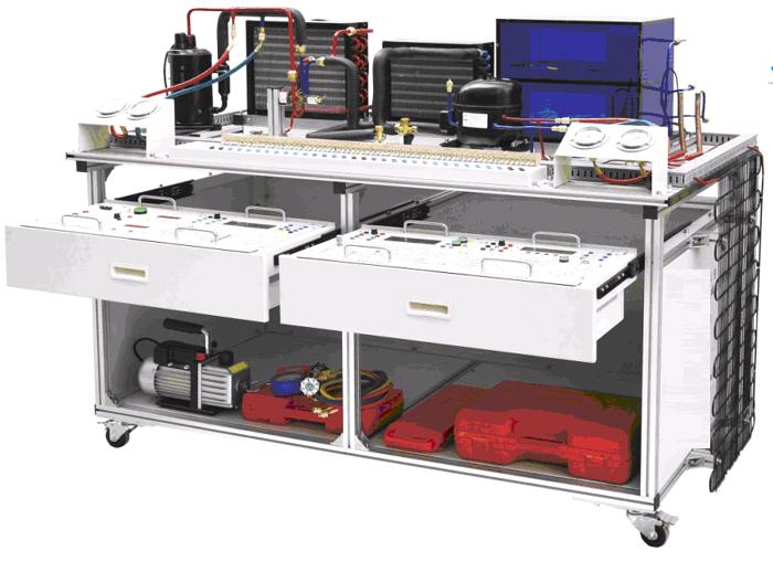 1、 實訓(xùn)臺采用鋁型材臺架加實訓(xùn)模塊結(jié)構(gòu),裝置采用一體化設(shè)計,由導(dǎo)軌式 鋁合金安裝平臺、空調(diào)系統(tǒng)、電冰箱系統(tǒng)、電氣控制系統(tǒng)等組成。底部安裝有四個帶剎車的腳輪,可以方便的移動和固定。
