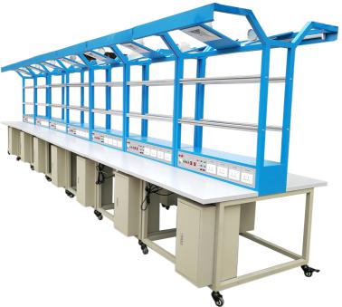 1、臺身部分:采用60mm*40mm(壁厚2mm)雙豎立柱方鋼組成的C型骨架,模具沖壓標準化連接件,表面經純環氧樹脂塑粉高溫固化處理,具防酸堿、防腐蝕的特點、且承重。桌子的底部采用帶固定升降式腳墊,方便調整設備的擺放位置及高度。每工位帶鐵制柜(上部抽屜、下部柜門、帶鎖)1只