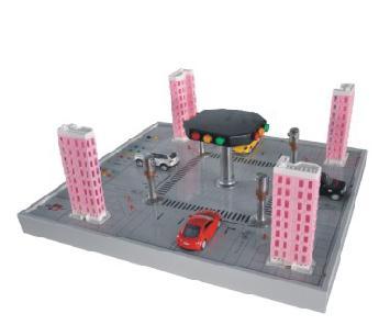 本企業設計開發的模型為實際十字路口現況按比例微縮而成,主要由仿真實物建筑模型、車輛實物模型、道路模型及交通指揮燈等部件組成。有電源指示和控制、啟/停按鈕、手/自動按鈕、行人呼叫按鈕、四方向紅/黃/綠燈點陣指示模塊(具有東西南北十二方向顯示)、四方向數碼倒計時顯示模塊,車輛行進聲光指示(不同方向的車行進時可用不同的聲音及指示燈進行指示)等。控制器采用;三菱主機為FX1N-24MR 內置開關量I/O(14路開關量輸入/10路數字量輸出)+FX2N-8EYR(8路數字量輸出)。選用的主機功能齊全,性能優越。實訓操作靈活方便,能滿足大中專院校、職業技術學校、職教中心可編程控制器技術的教學、課程設計和畢業設計。