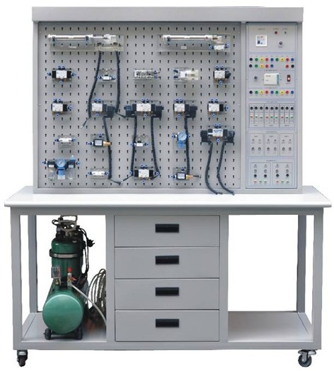 該實驗臺是根據《液壓氣動傳動技術與實訓》、《氣動控制技術》等通用教材設計而成,集可編程控制器和工業氣動元件、執行模塊為一體,除可進行常規的氣動基本控制回路實驗外,還可以進行模擬氣動控制技術應用實驗、氣動技術課程設計。采用PLC控制方式,可從學習簡單的PLC指導編程、梯形圖編程,深入到PLC控制的應用,可與計算機通訊、在線調試等實驗功能,能完美結合氣動技術和電氣PLC控制技術,適用電工、機電一體化等專業實訓考核。 一、主要特點: 1.模塊化的結構設計搭建實驗簡單、方便,各氣動元件成獨立模塊,配有方便安裝的底板,實驗時可以隨意在通用鋁合金型材板上組建各種實驗回路,操件簡單快捷。 2.快速可靠的連接接頭,拆卸簡便省時。 3.采用標準的工業氣動元件,性能可靠、安全。 4.低噪音的工作泵站,提供一個安靜的實驗環境(噪聲<60)。 二、實驗項目: ① PLC控制回路實驗: 1.單作用氣缸的換向回路 2.雙作用氣缸的換向回路 3.一次壓力控制回路 4.二次壓力控制回路 5.高低壓切換回路 6.雙作用氣缸的雙向調速回路(進口調節、出口調節) 7.速度換接回路 8.緩沖回路 9.互鎖回路 10.過載保護回路 11.位置控制式單往復回路 12.壓力控制式單往復回路 13.時間控制式單往復回路 14.單雙作用缸連續往復動作回路 15.采用節流閥的同步回路 16.三缸連動回路 17.計數回路 18.延時回路 19.邏輯閥的應用回路(或邏輯) 20.雙手操作回路 ② 繼電器控制回路 汽缸緩沖回路 汽缸給進系統 雙缸動作回路 ② 可編程序控制器(PLC)電氣控制實驗,機-電-氣一體化控制實驗: ⑴ PLC指令編程、梯形圖編程學習 ⑵ PLC編程軟件的學習與使用 ⑶ PLC與計算機的通訊、在線調試 ⑷ PLC與氣動相結合的控制實驗 ⑸ PLC指令編程實訓 ③ 學生自行設計、組裝和擴展各種回路實驗 三、實驗臺組成: 實驗臺由實驗臺架、工作泵站、氣動元件、電氣控制單元等幾部分組成。 1.實驗臺架:實驗臺架由鐵制主體、鋁合金操作面板等構成 工作臺尺寸:長×寬×高=1500mm×850mm×1800mm (其包裝重量約270kg) 2.工作泵站: 氣泵輸入電壓:AC 220V/50Hz;電機(雙頭)功率:800W;額定輸出壓力:0.8Mpa; 氣泵容積:20L;工作噪聲:< 60分貝。 3.氣動元件: 以JELPC氣動元件為主,配置詳見附件。 氣動元件均配有過渡底板(工程塑料),可方便、隨意地將元件安放在實驗面板(面板帶“T”溝槽形式的鋁合金型材結構)上?;芈反罱硬捎每鞊Q接頭,拆接方便快捷。 4.電氣控制單元: 可編程序控制器(PLC);采用三菱系列,I/O口20點;繼電器輸出形式。 電源電壓:AC 220V/50Hz 透明液壓氣動綜合實驗臺(氣動部份)配置清單