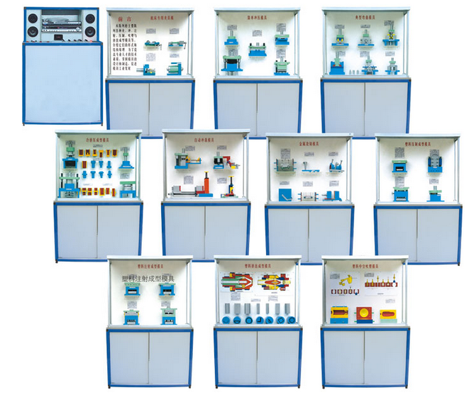 本公司力求實用根據(jù)學校教學要求需要、特制一套《冷沖壓與塑料成型工藝及模具設計》與《塑料成型模具》等教材設計而成的模具示教陳列柜,這套陳列柜共分十個柜, 具有多功能語音播放控制系統(tǒng)。可由遙控控制順序自動講解,又能根據(jù)教材、教學需要而遙控任意選擇講解。柜體采用鋁木結(jié)構,堅固美觀可靠,柜內(nèi)模型材料采用工程塑料制作,板面附有必要文字說明,演示形象逼真,制作工藝美觀,使用本陳列柜提高教學效果,是一套現(xiàn)代化模具設計課程應用陳列室設備。