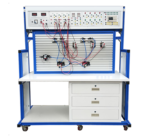 該氣動PLC控制綜合實訓裝置采用“平臺式設計、模塊化組合式應用”的新思路,氣動元件選用的工業級器件,力求做到真實、直觀,各氣動元件配有卡裝式快速裝接底板。學員根據所設計的氣動控制回路要求選用氣動元件,快速的通過專門設計的連接裝置可方便可靠的鎖緊在鋁合金實驗臺上,操作方便、簡捷。設備配置有常用氣動元件、可編程控制器模塊,電源模塊,按鈕模塊,時間繼電器模塊,繼電器模塊等器件,學生可獨立地進行氣壓回路設計、安裝、調試、故障排除、編制控制程序等操作實訓,從而提高學生的學習興趣、增強實踐動手能力、獨立思考問題和解決問題的能力。